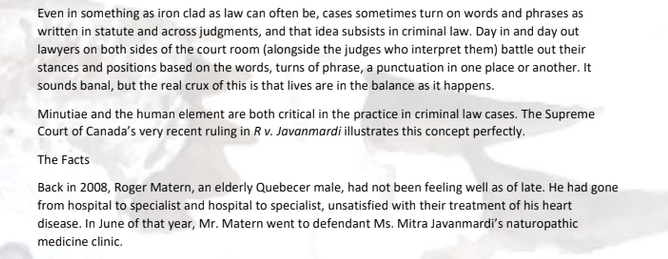 Actus Reus issues in criminal law – R. v. Javanmardi (2019) 2019 SCC 54M Badejo - law studentDec 9, 20191 min readsee the full text at: https://canliiconnects.org/en/summaries/67942